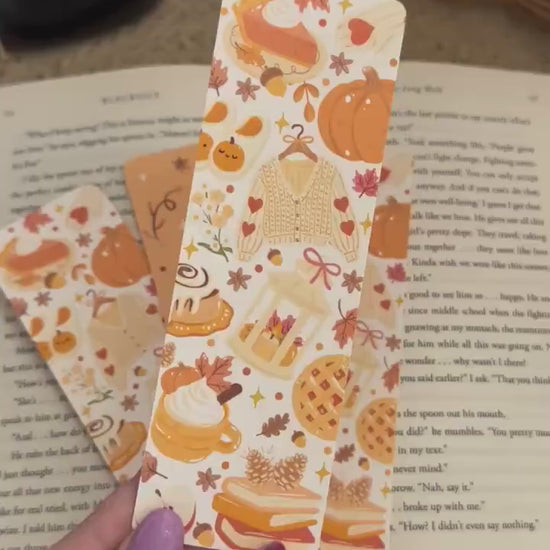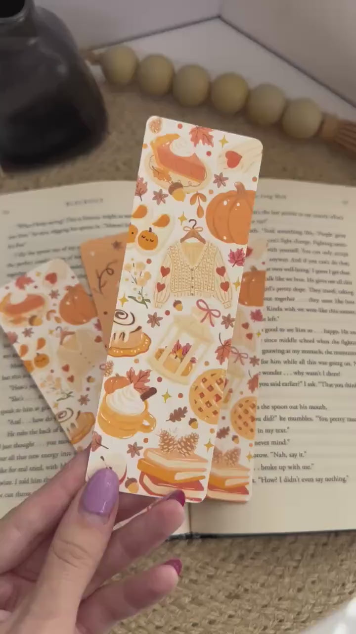 Each bookmark features warm pumpkin designs, fall leaves, and cozy seasonal illustrations like pies, sweaters, and lattes – the perfect accessory for book lovers during sweater weather.