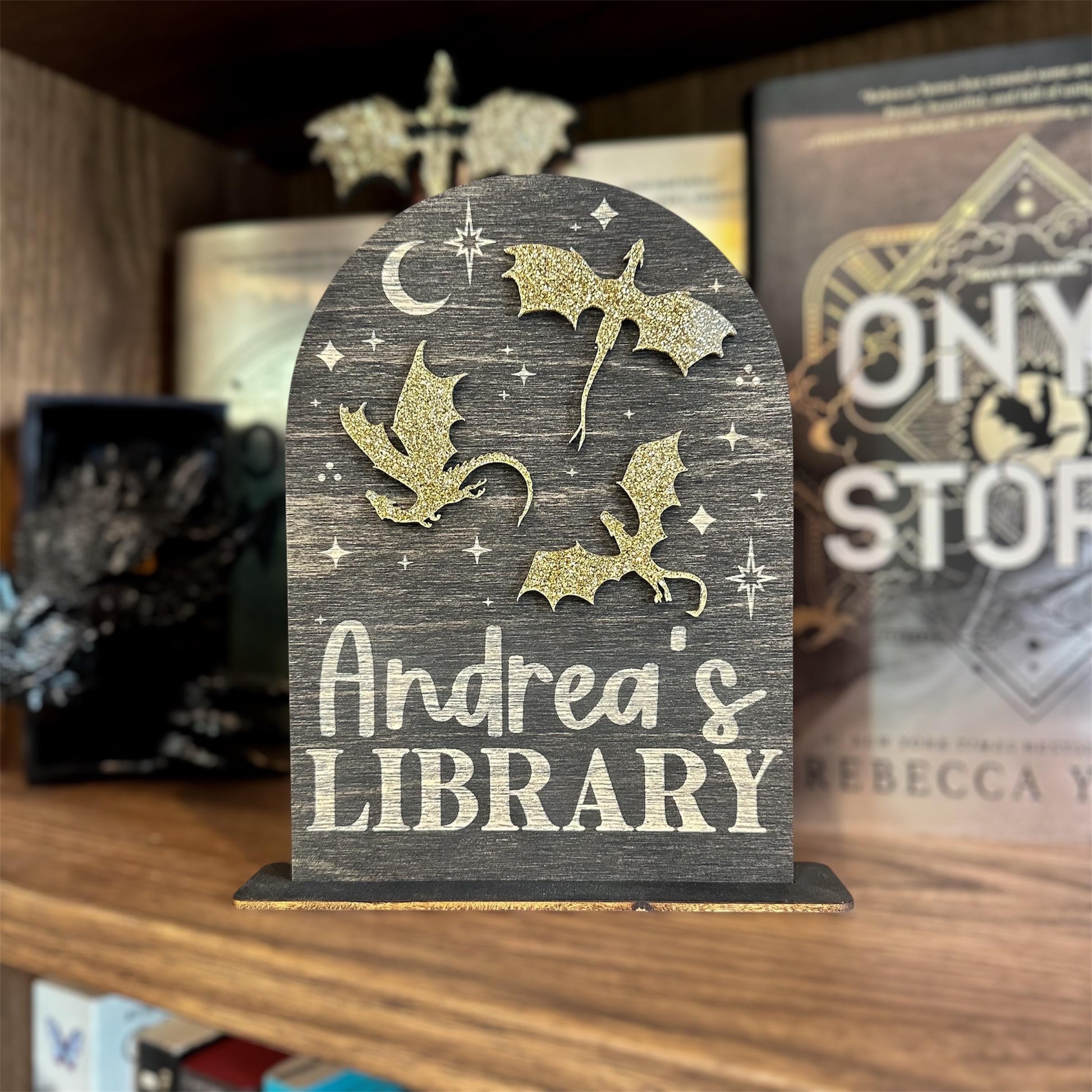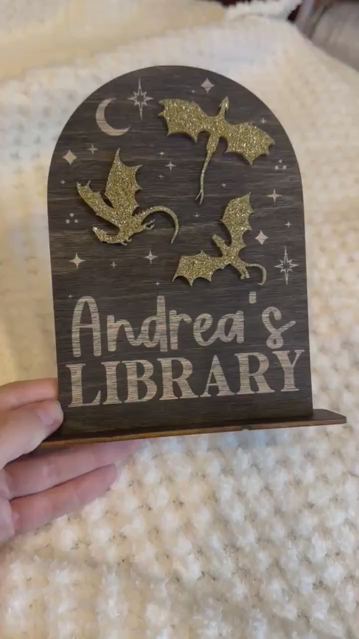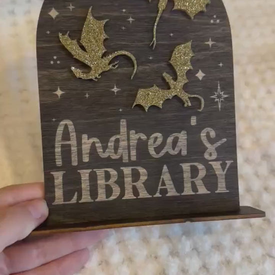 Spice up your bookshelf with this custom dragon library sign! Handcrafted and laser engraved, this piece will be sure to make a statement on your bookshelf! Or surprise your book-bestie with this personalized gift!