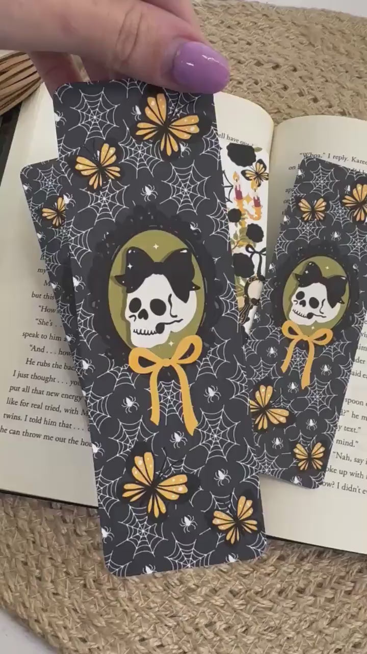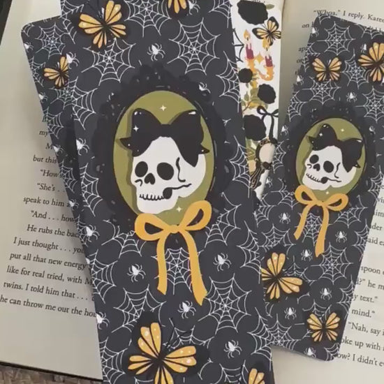 Dark academia gothic bookmarks. Featuring double-sided designs with skulls, butterflies, cobwebs, and vintage-inspired details, these bookmarks are perfect for lovers of Halloween, witchy vibes, and gothic literature.